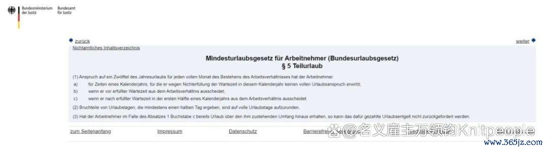 德国年假在《德国联邦放假法》(“ Bundesurlaubgesetz” 笔名 BUrlG)中有所章程。在德国,职工每周责任6天,每年至少有权享受24个责任日的带薪年假。当公司的规范责任周少于6天时,放假天数应相应变调。例如,淌若职工每周责任5天,即周一至周五,则年假权益为每年20个责任日的带薪年假。